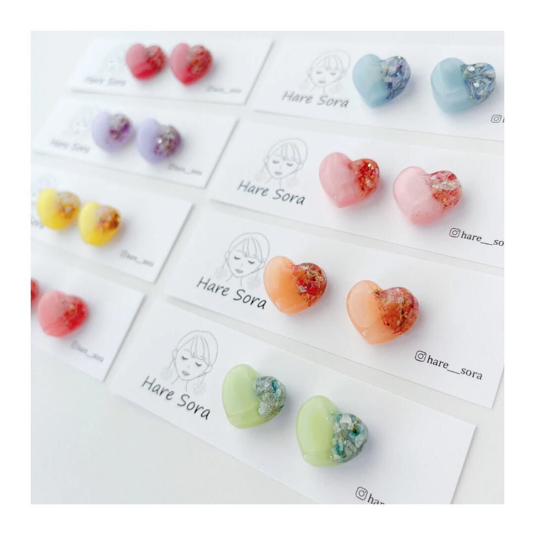 小さな花びらたちをレジンで閉じ込め、だーいすきなカラーで彩り、ぷっくりハートで仕上げました